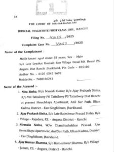 मोज़िब अंसारी, निवासी हेसल (अनगड़ा), ने न्यायिक मजिस्ट्रेट प्रथम श्रेणी, रांची की अदालत में शिकायत दर्ज कर आरोप लगाया है कि कुछ लोगों ने मिलकर उनकी कीमती जमीन पर फर्जीवाड़ा करते हुए कब्ज़ा कर लिया।